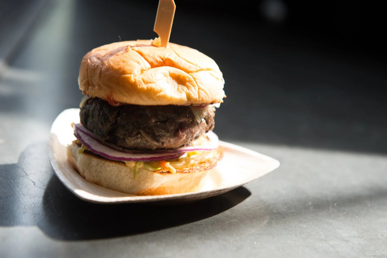 Harissa Aïoli, Broccoli Slaw, Ketchup, Red Onion, Cheddar Cheese, Hawaiian Bun