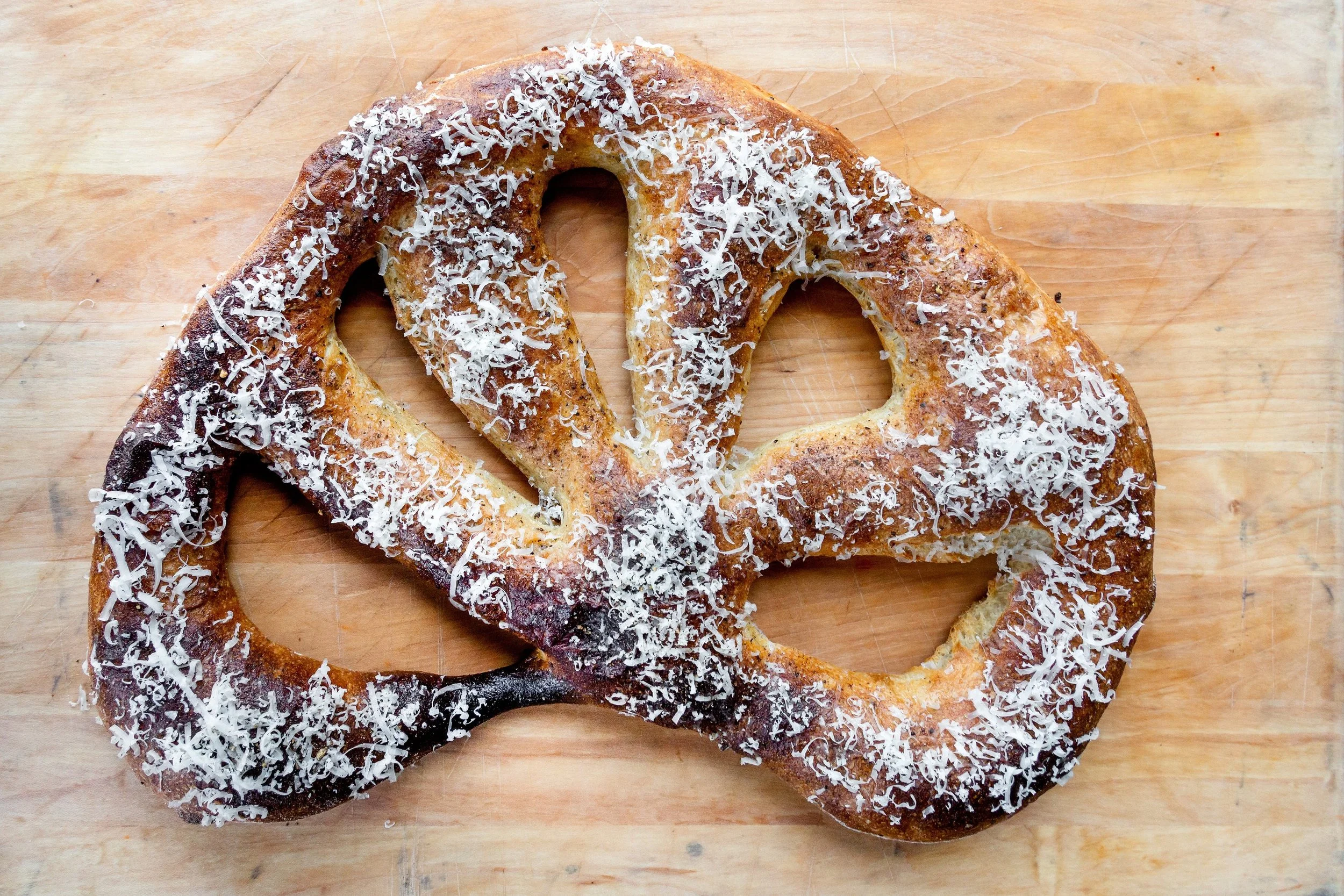 In the bowl of a stand mixer fitted with a dough hook attachment, combine yeast, Autolyse, 1.25 kilograms ripe Poolish, 600 grams mature Levain. Mix 3 to 4 minutes or until dough ball forms. Let rest 5 minutes. Add salt and 200 grams water. On low speed, mix 3 to 4 minutes. Let rest 5 minutes. Dough should be stretchy, strong, and pass the windowpane test. Add olive oil. On medium speed, mix 2 minutes. Add scald. On low speed, mix until homogenous and there are no visible streaks. Mix in more water as needed. Transfer dough to a well-greased container with enough room to triple in size. Let proof 1 hour, coil-folding the dough every 20 minutes. After the third fold, let bulk ferment 1 hour and 30 minutes to 2 hours. Cut and portion the dough into 600-gram rounds. Place each round onto a well-floured couches. Let rest 1 hour. Heat a deck oven to 500°F on steam. Place the rounds onto a well-floured work surface. Using a plastic bench cutter, cut 4 to 5 lines into the dough, stretching with each cut to prevent dough from resealing. Stretch to desired shape. Load fougasse onto a bread peel, then bake 13 to 15 minutes, venting after 5 minutes. Place fougasses on a metal rack. Brush with olive oil, then top with black pepper, Grana Padano, and sea salt flakes.