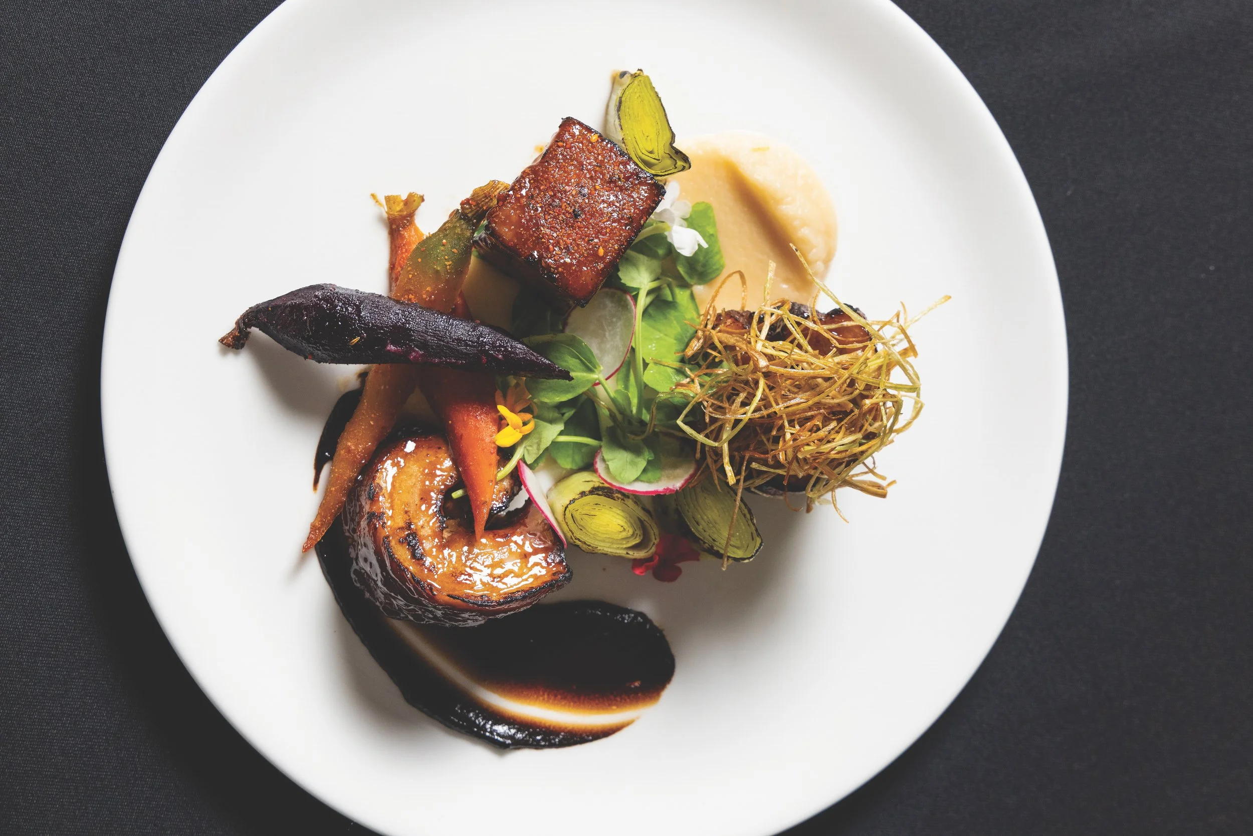 Heat oven to 350°F. On a work surface, slice 2 roulades rolled Pork Belly and 1 cube Pork Belly. Transfer to a sheet tray and roast 5 minutes, or until warmed through. Brush Pork Belly with Chashu Barbecue Sauce. Using a blow torch, char outside of Pork Belly. Set aside. In a small bowl, toss to coat pea tendrils and radishes in oil. Set aside. Spread 1 spoonful Guava-Apple Purée on one side of a serving plate. Top with 1 Pork Belly roulade. On the other side, spread 1 spoonful Black Garlic Purée. Top with second Pork Belly roulade and dressed salad. Brush Pork Belly roulades with additional Chashu Barbecue Sauce. Place 1 Pork Belly cube at the bottom of the plate to form a triangle. Dust with togarashi. Place 2 Confit Leeks near each Pork Belly piece and 3 Togarashi Carrots near the Black Garlic Purée. Garnish with Fried Leeks.