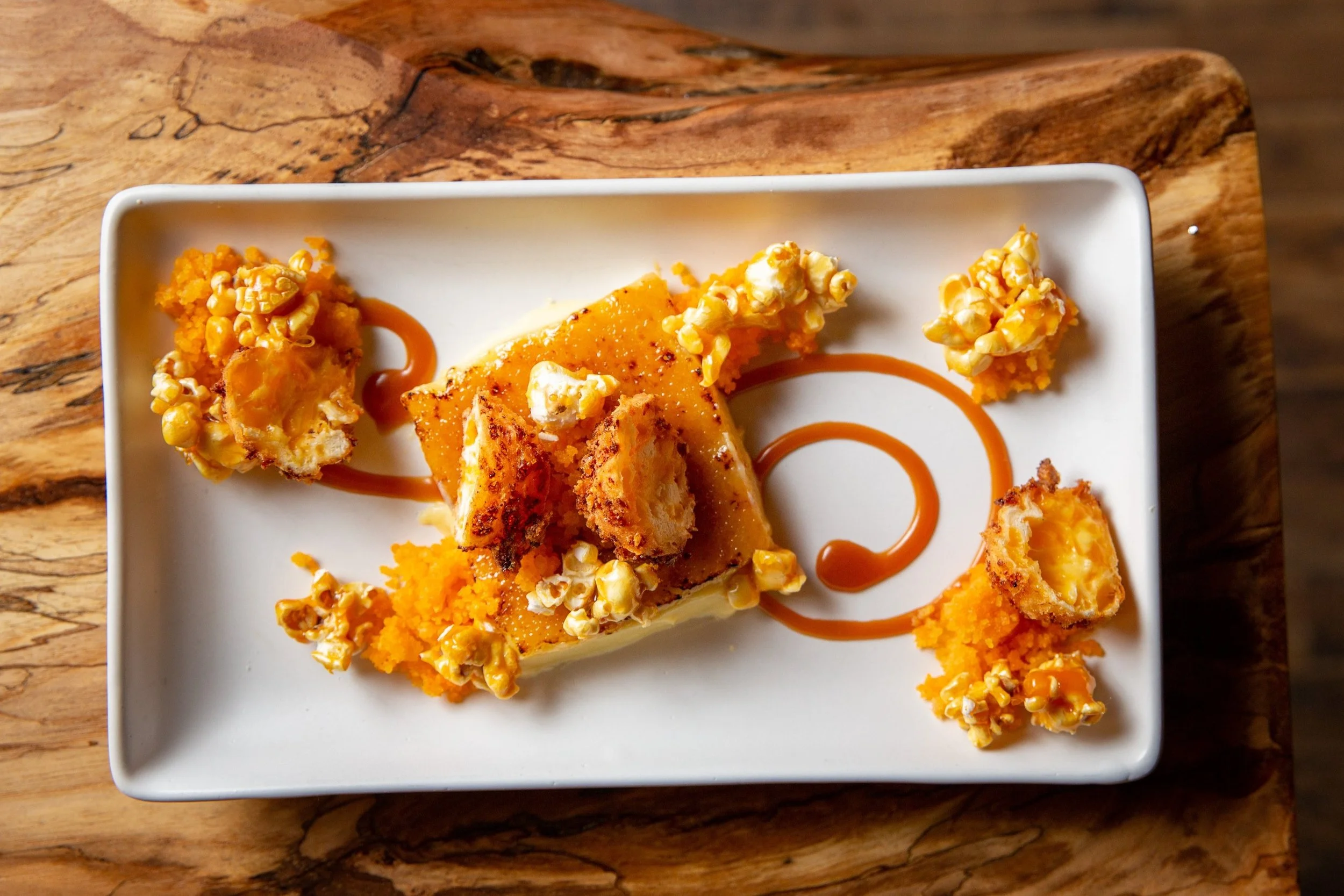 Pull a Popcorn Crème Brûlée and immediately start a timer for 6 minutes. While the timer is running, scoop 2 balls of Cheddar Fritter Mix using a melon baller then, using your hands, roll balls to ensure they are tightly packed. Fry Cheddar Fritter Mix 1 minute and 30 seconds to 2 minutes. Remove from fryer and slice Cheddar Fritters in half. Drizzle caramel sauce onto the bottom of a serving plate. On each end of the plate, place a pile of Cheddar Cake Crumble and 3 pieces Caramel Popcorn. Once the timer goes off, liberally dust Popcorn Crème Brûlée with sugar, torch until golden and glassy, then sprinkle with a pinch of salt. Plate torched Popcorn Crème Brûlée in the center of the serving plate. Place 1 half Cheddar Fritter on each end of the plate. Place remaining halves and 1 piece Caramel Popcorn on top of the Popcorn Crème Brûlée.