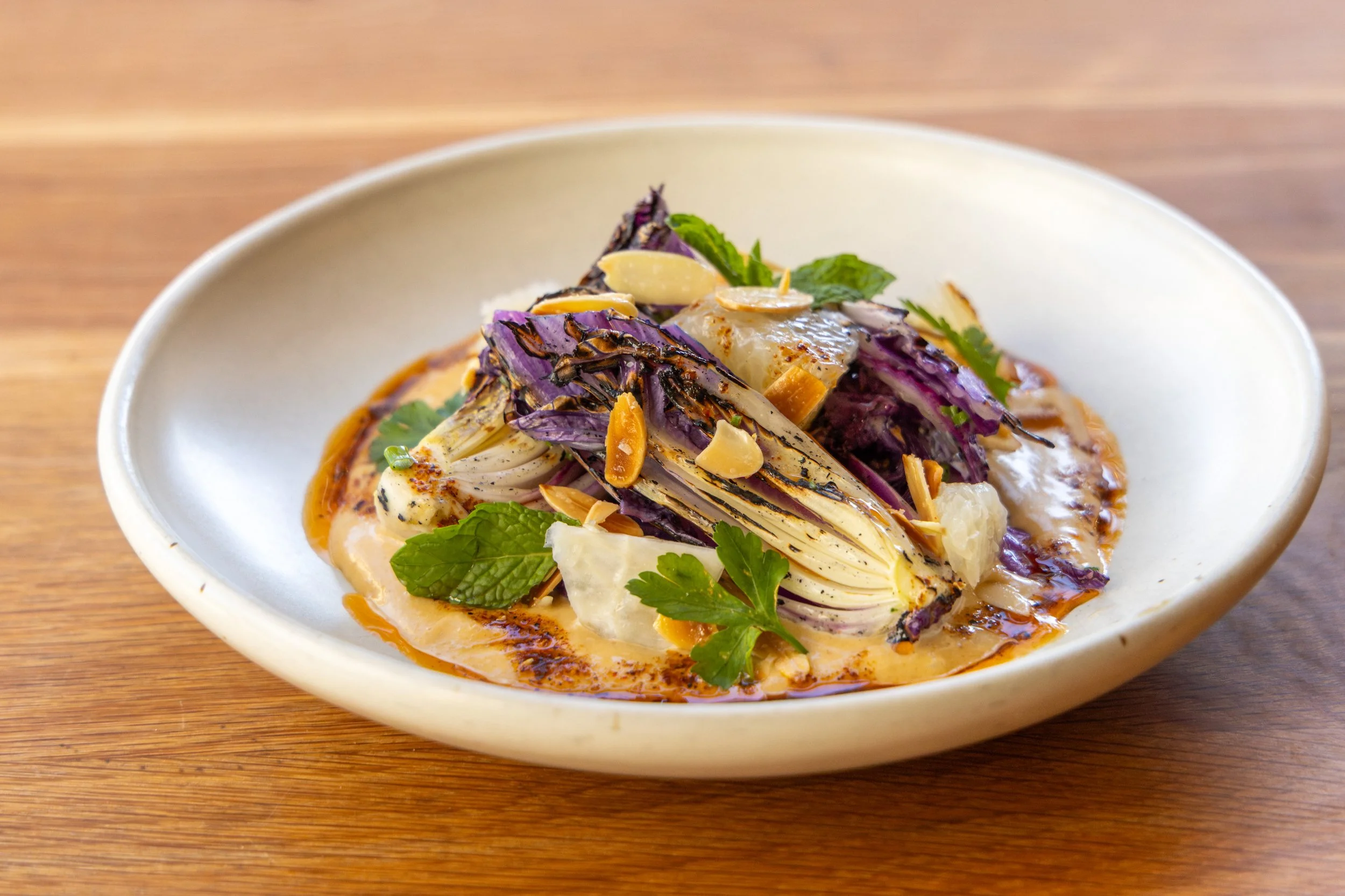 This dish was inspired by Octavia’s commitment to seasonal ingredients and the best local produce, including California almonds. The choice of grapefruit and cabbage shaped a preparation that highlights the almonds in two ways: as toasted, salted almonds that bring crunch and salinity, and as an almond paste that adds sweet, nutty, and earthy depth to the sauce. A Japanese-style sesame goma sauce forms the base, enriched with fresh almond paste to build on the savory notes of sesame paste and alliums. The focus is balance, contrasting the earthy sweetness of Napa cabbage and goma sauce with the bright acidity of Oro Blanco grapefruit to keep the palate fresh and invite another bite. A final touch of Sichuan chile oil adds a subtle, engaging tingle on the finish.