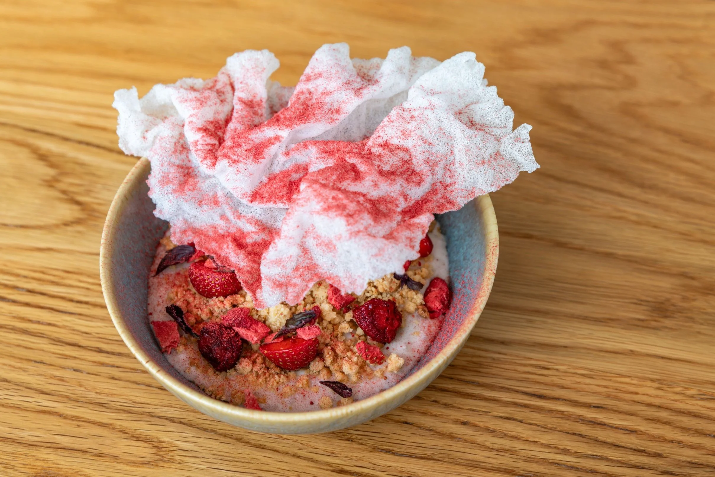 On a work surface, dust 1 Fried Rice Cracker with freeze-dried strawberry powder. Set aside. Spoon Rice Pudding into a serving bowl. Top with Strawberry-Urfa Sauce followed by Coconut Shortbread Crumble, 4 Roasted Strawberries and 4 fresh strawberries. Top with additional layer Coconut Shortbread Crumble, 4 Roasted Strawberries and 4 fresh strawberries. Dust with additional freeze-dried strawberry powder. Garnish with basil and dusted Fried Rice Cracker.