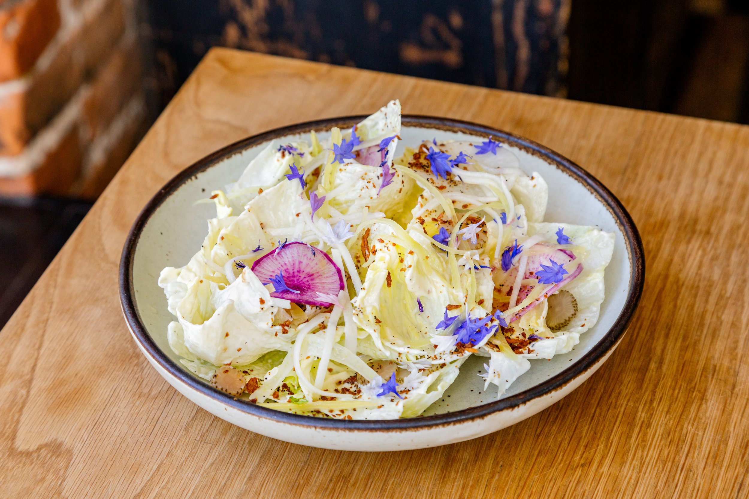 In a mixing bowl, toss to combine lettuce, raw vegetables, pickled vegetables, 175 grams Shio Koji Dressing, and 75 grams Sunchoke Crumble. Transfer to a serving bowl. Garnish with edible flowers.