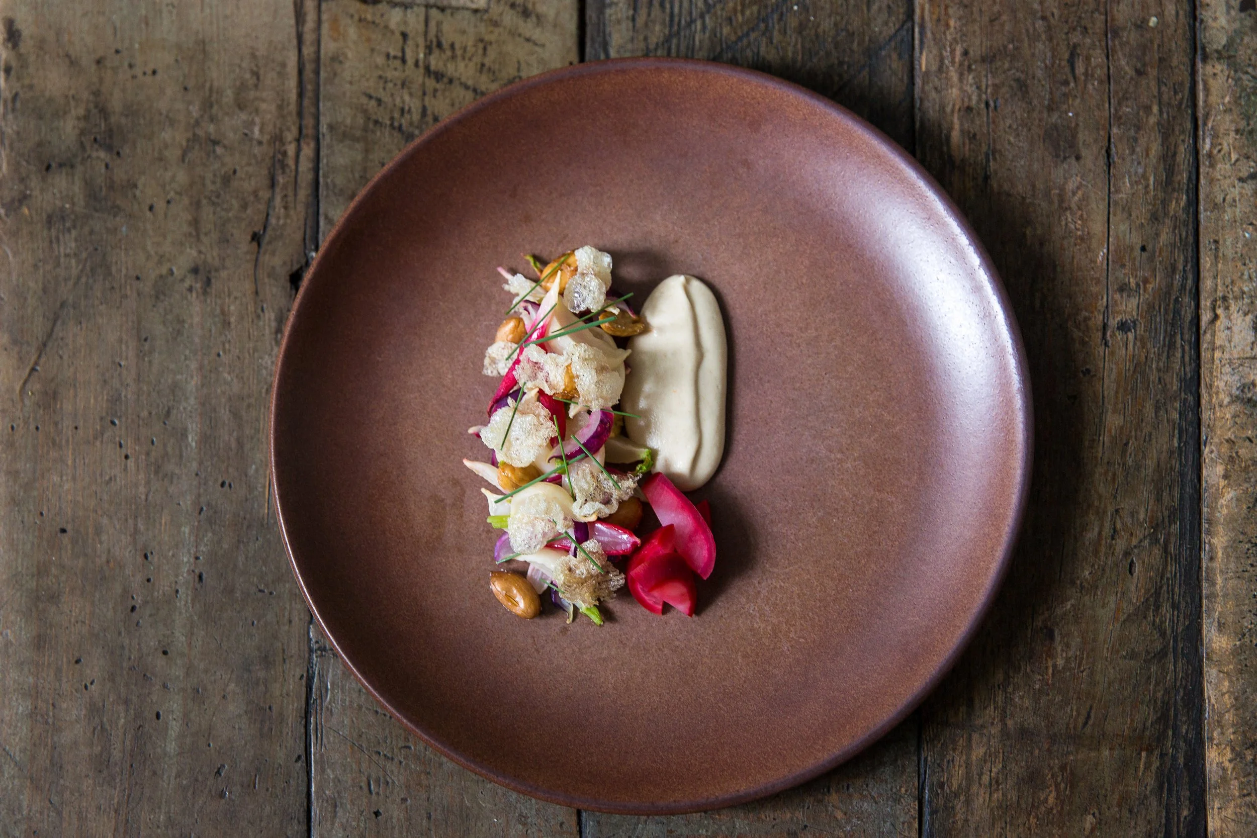 Heat oil in a deep fryer to 375°F. Fry 3 pieces Beef Tendon—they should puff almost instantly. Drain on paper towels and season with salt. Toss to coat ½ cup each Cured Turnips and Radishes with a pinch of salt and 2 teaspoons Beef Fat Dressing. Spoon 2 tablespoons Boiled Peanut Tahini on a plate and place the Cured Turnips and Radishes in a line to one side. Garnish with 1 tablespoon Pickled Turnips, 1 tablespoon fried boiled peanuts, and the Beef Tendon.