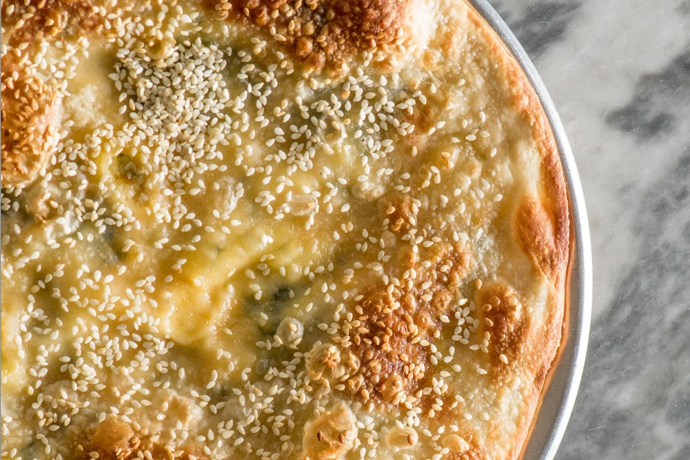 Garlic Oil, American Grana, Stracchino, and Sesame Seeds