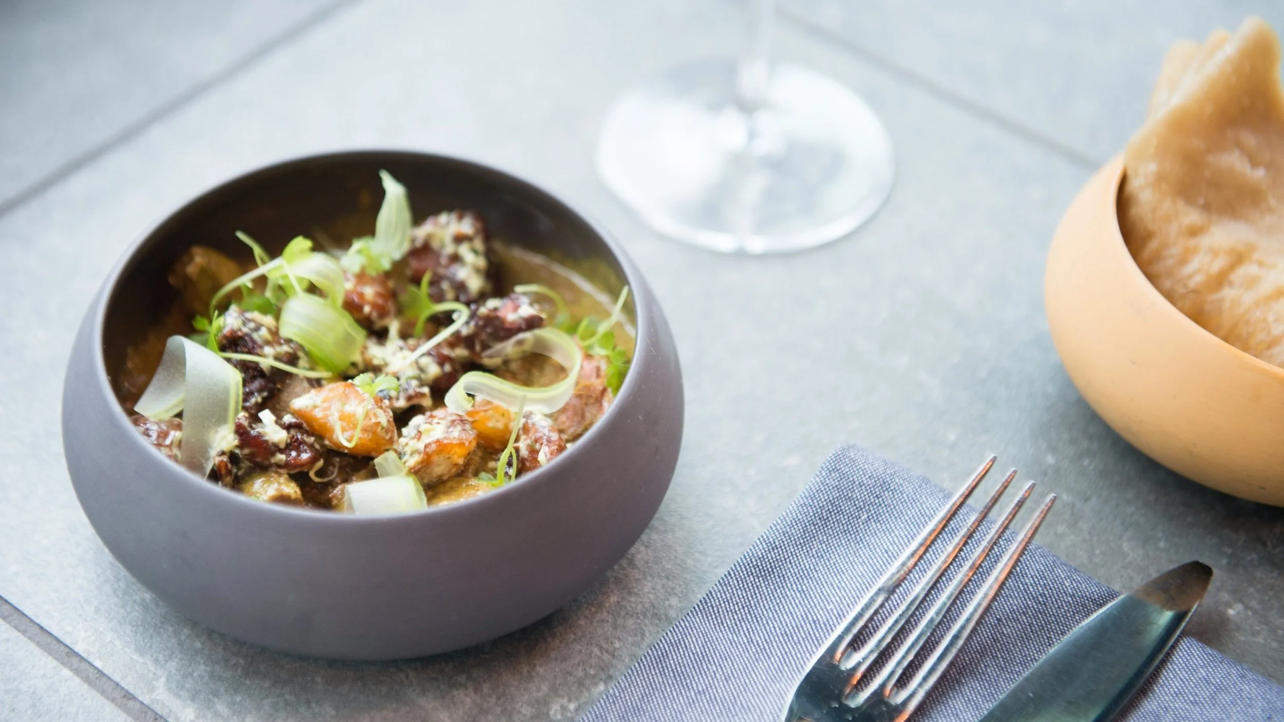 Curried Australian Goat, Potatoes, Curry Velouté, Green Seasoning Aïoli, Celery, Roti