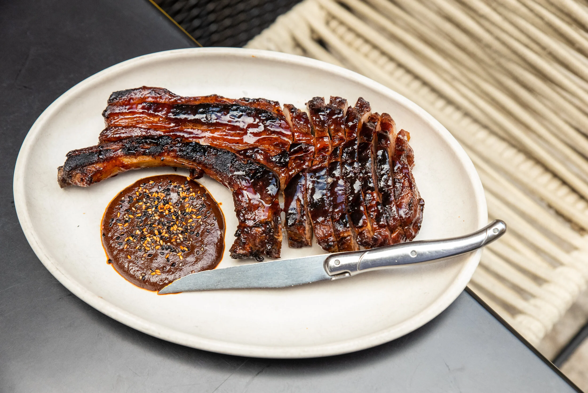 Heavily season one Pork Chop with salt and temper. Brush with a little oil and grill until medium. Transfer Pork Chop to a cutting board and let rest 20 minutes. Before serving, return Pork Chop to grill, rotating it and glazing with Corn Husk Glaze. Slice the Pork Chop evenly and transfer to a large plate. Brush once more with Corn Husk Glaze and place the desired amount of Mole Rojo next to the Pork Chop. Sprinkle with Maldon salt and serve.