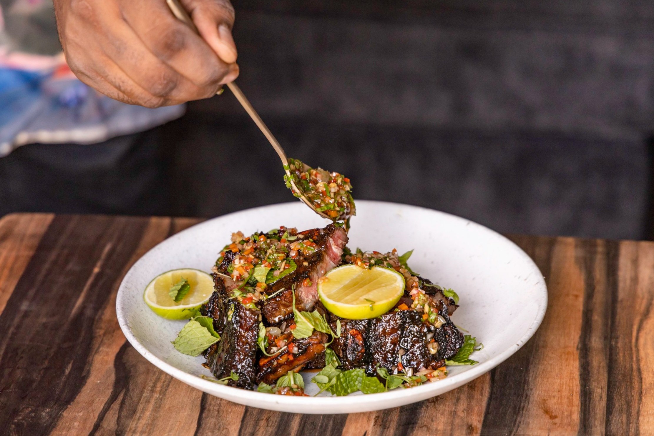 Soy-Angostura Bitters Glaze, Garlic Rice, Chinese Celery, Peanuts, Cilantro, Lime | Akhtar Nawab of Alta Calidad