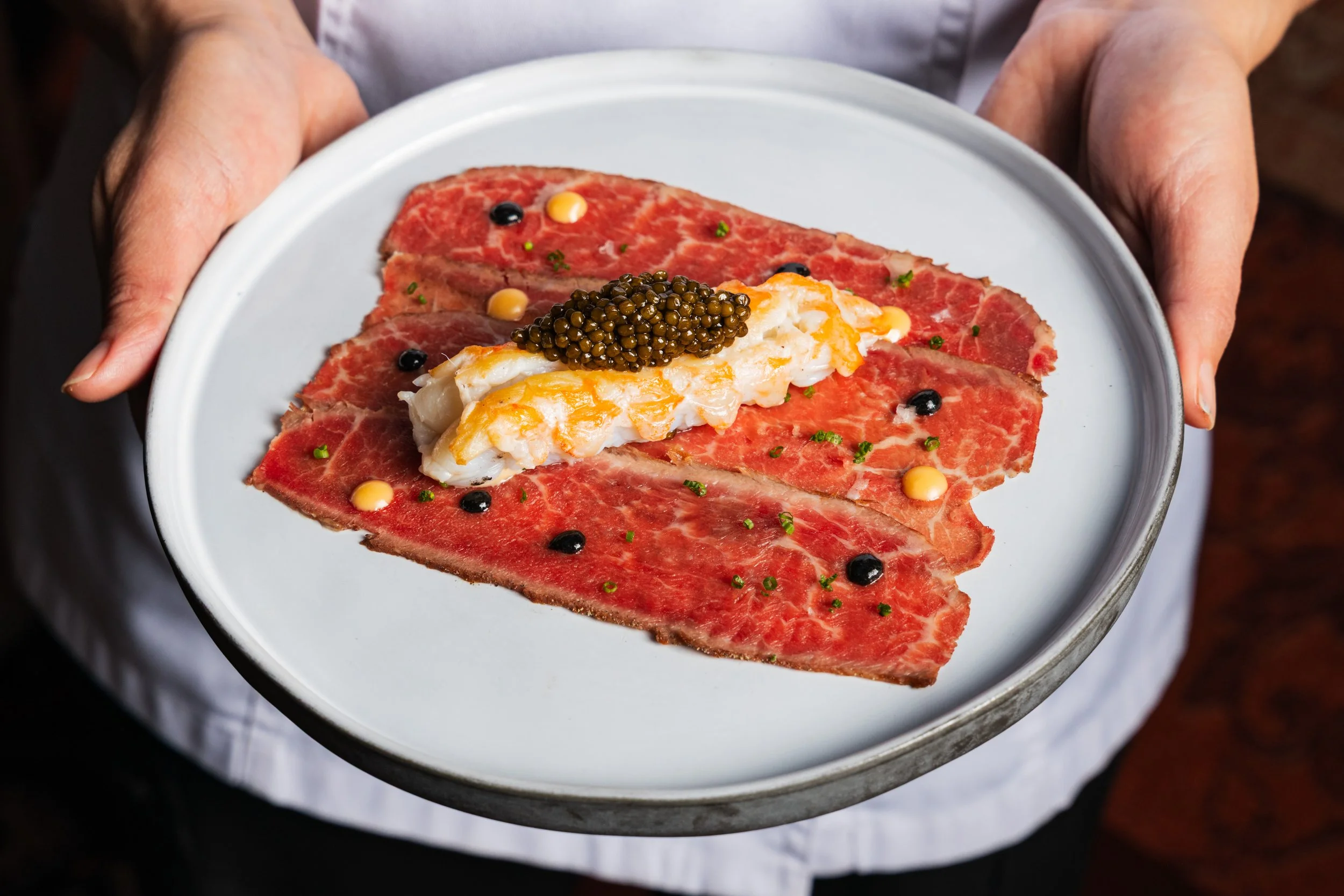 Brush serving plate with ibérico fat. Season with black pepper. Top with Ibérico Carpaccio. Season with olive oil and flaky salt. Place Langoustine Tails over top, facing opposite directions. Dot plate with 4 grams Crustacean Mayonnaise and drizzle with 4 grams Black Sesame Seed Praline. Finish with caviar and chives.