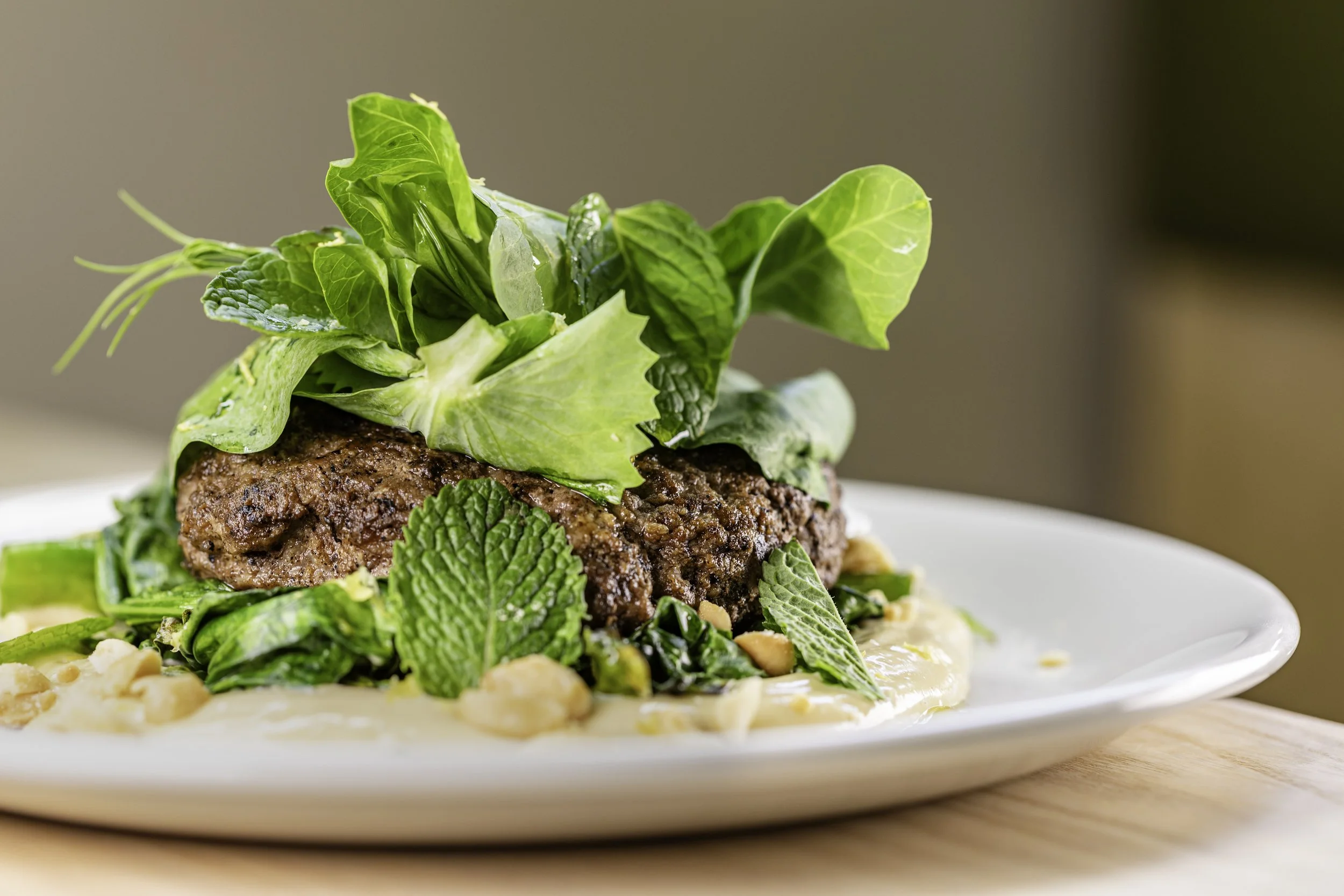 In the same cast iron skillet used for the Lamb, sauté greens over medium heat until the greens are bright and tender. Be careful not to over cook. Set aside. Spread 2 cups Fermented Bean Curd generously on a serving platter. Top with sautéed greens followed by 1 Lamb Patty and a large handful of Herb Salad. Garnish with chopped macadamia nuts. Finish with lemon zest and salt.