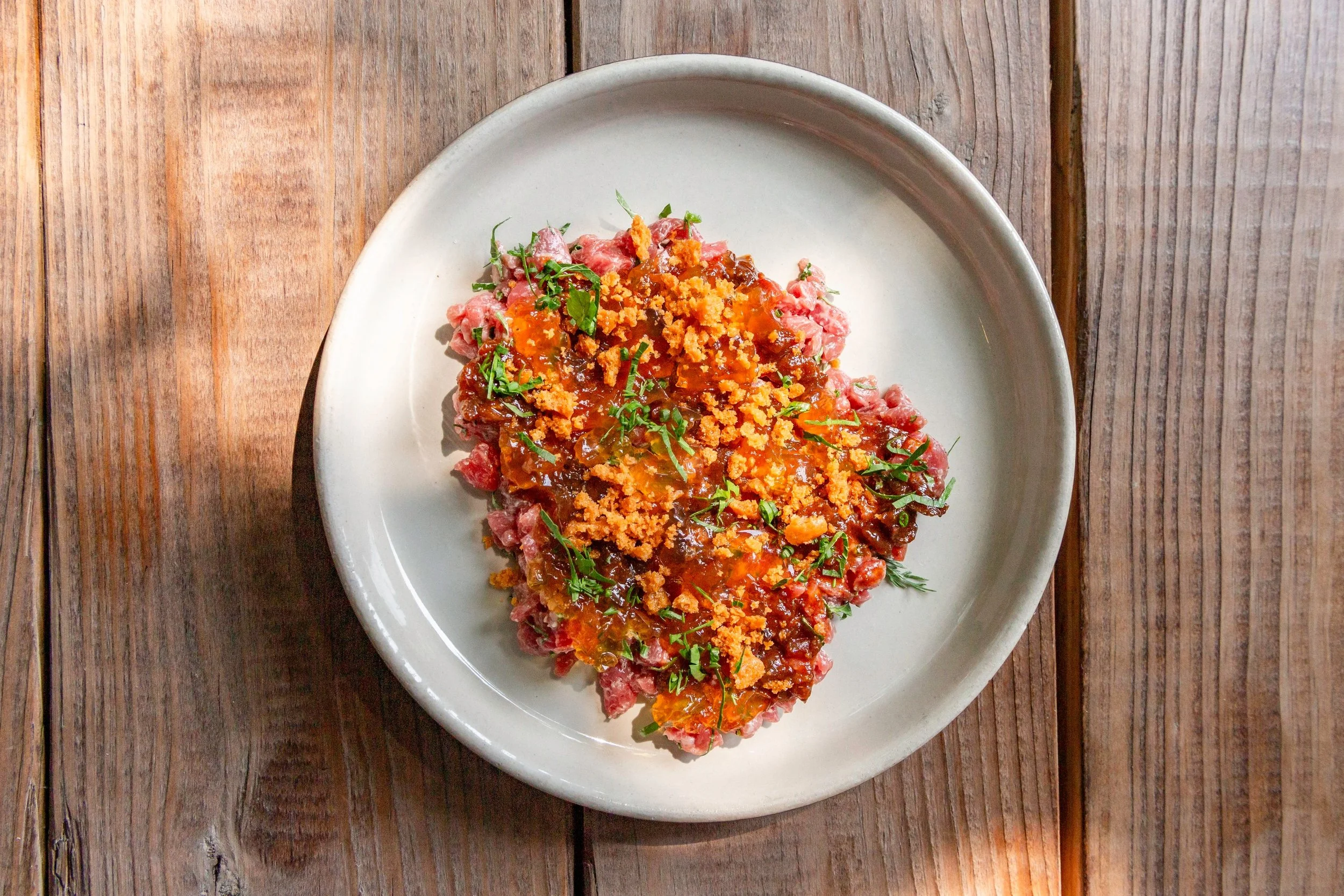 In a mixing bowl, combine Lamb Tartare with a spoonful of Smoked Lamb Fat. Season with salt, pepper, lemon juice, and chopped parsley. On a chilled serving plate, spread Lamb Tartare amorphously. Camouflage with Lamb Jelly, Steak Sauce Chutney, and fried breadcrumbs.