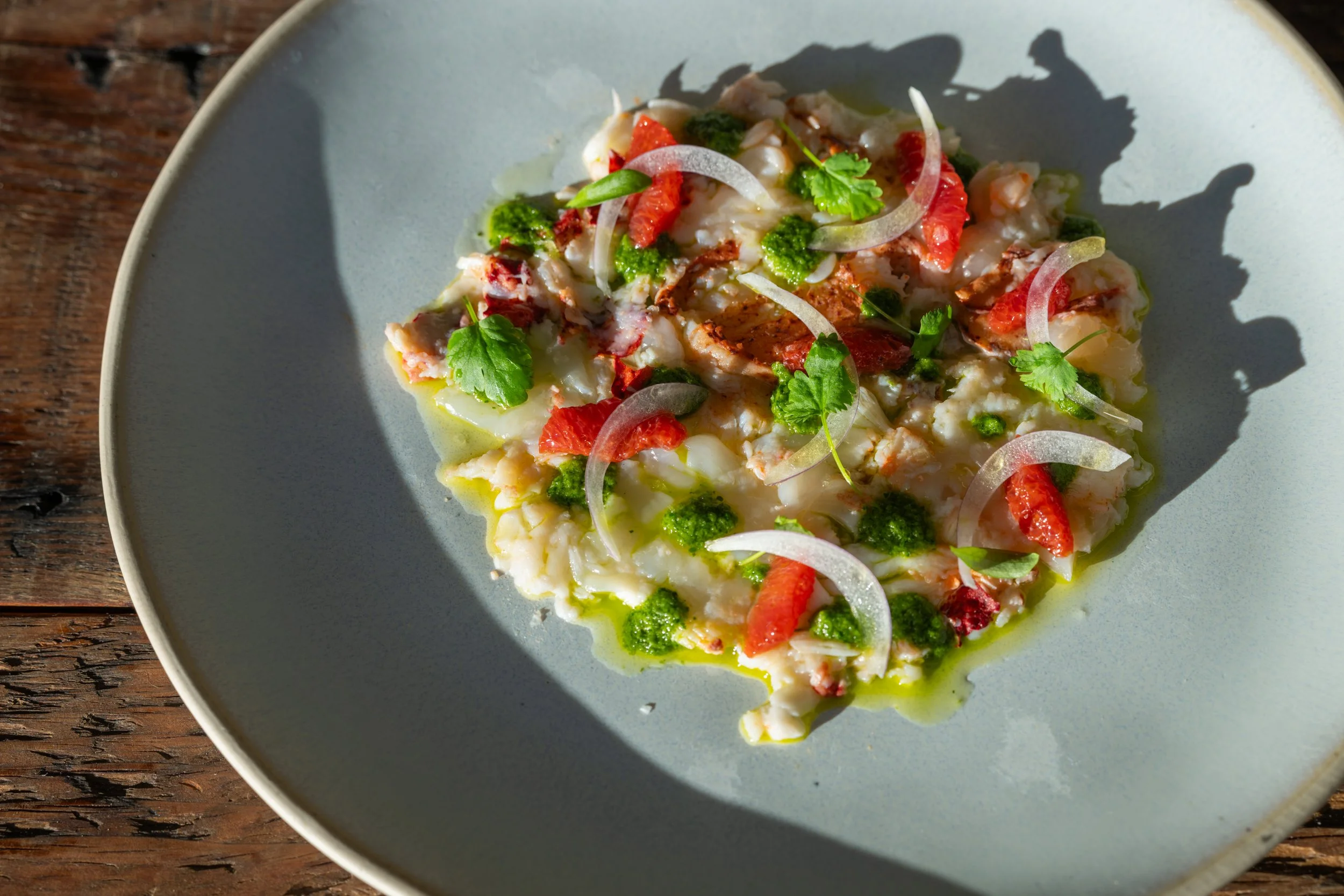 Adobo Aguachile, Blood Orange, Olive Oil, Cilantro, Flaky Salt