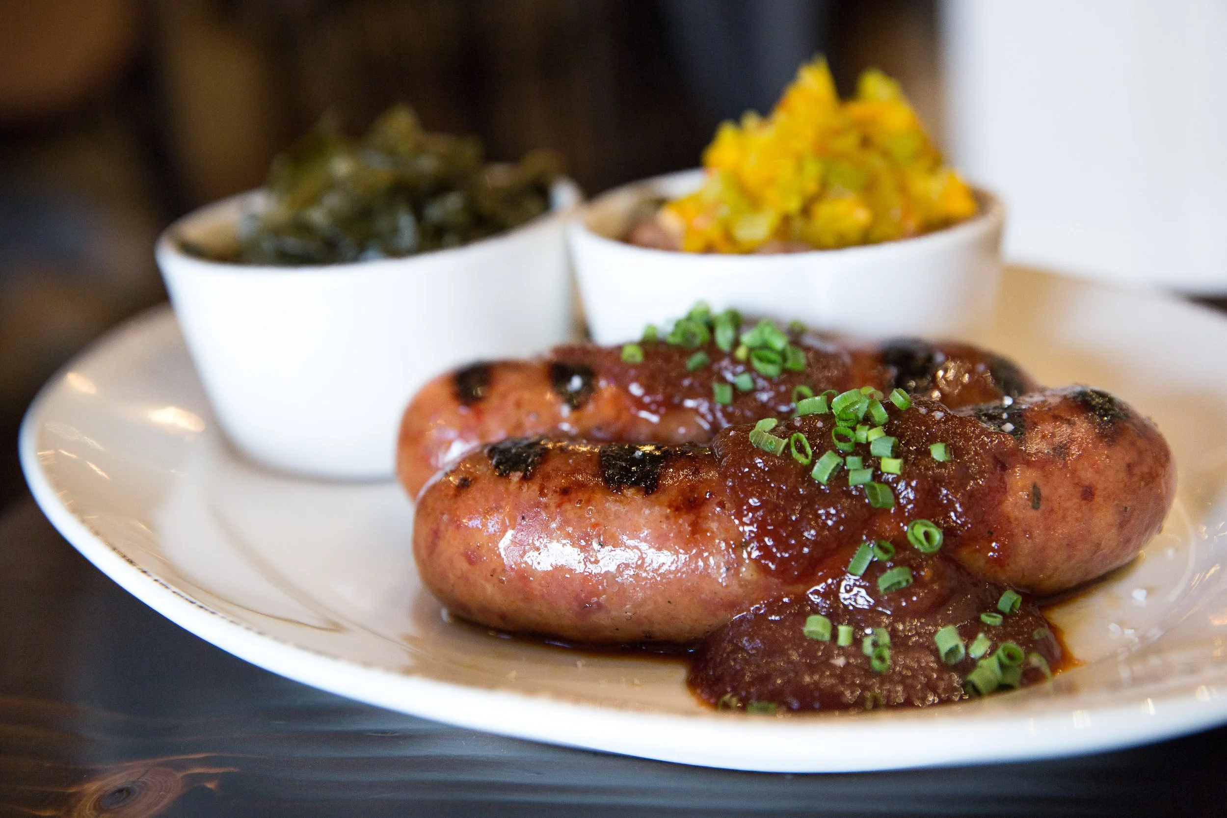Heat grill high on high flame, and cook sausages until heated through. Plate and slather with Coca-Cola Glaze. Garnish with sea salt and chives.