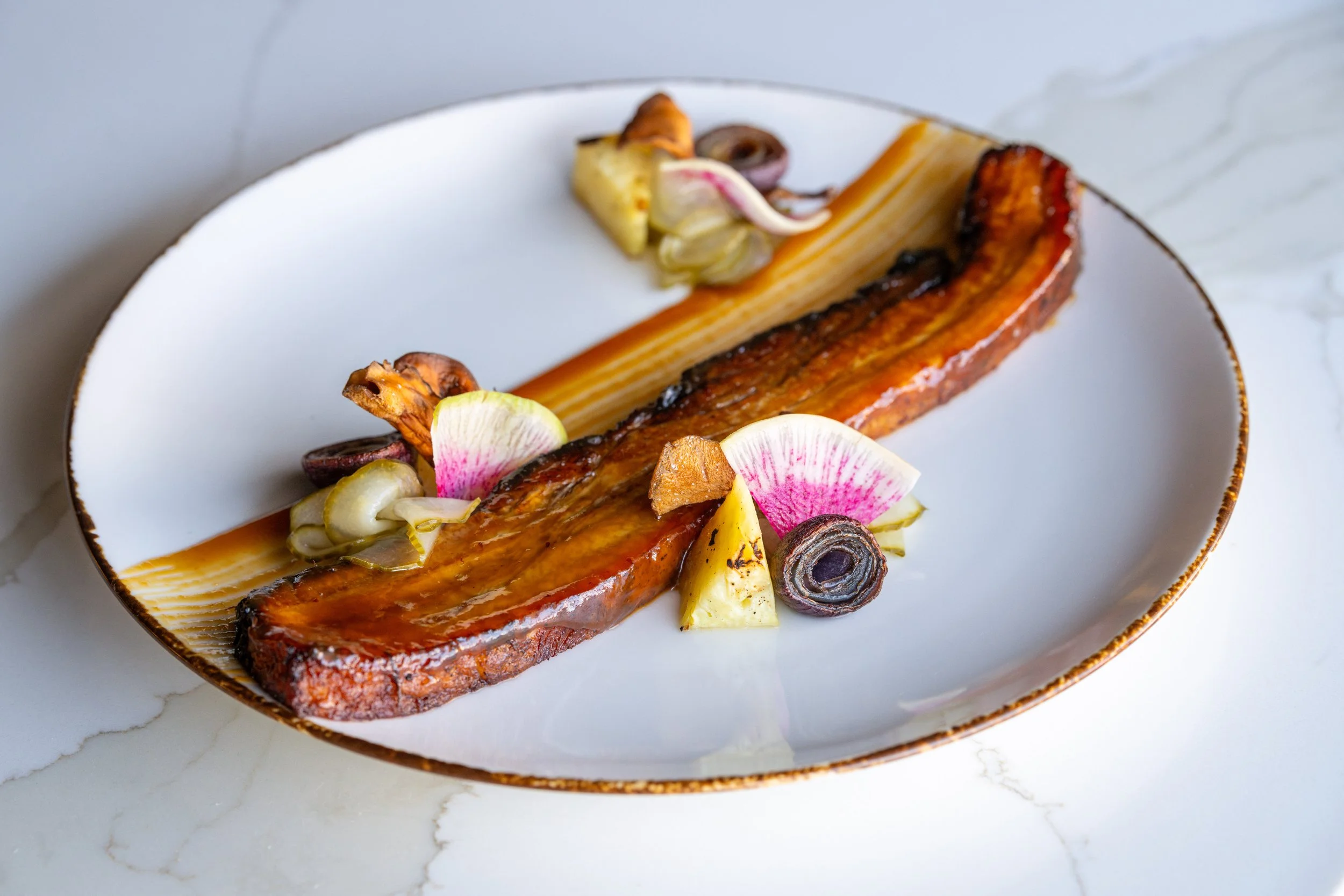 Niman Ranch Pork Belly, Shishito Soubise, Spiced Pork Jus, Red Oak Leaves | Joe Hou of Tenderheart at The LINE SF
