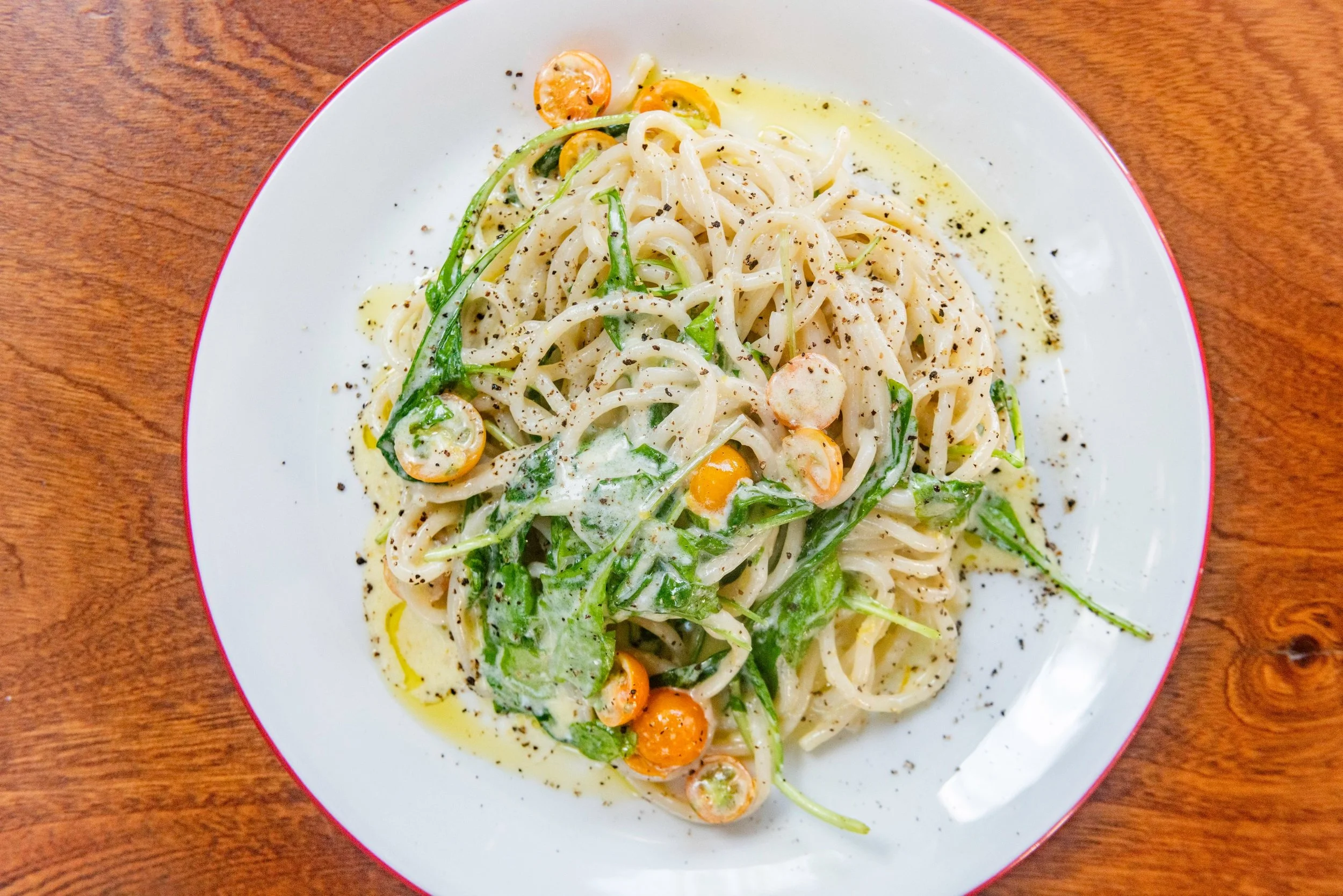 Bring a large pot of salted water to a boil and cook spaghetti until al dente. In a large bowl, whisk together crème fraîche, lemon zest, lemon juice, cheese, olive oil, and a large pinch of salt and black pepper. Taste and adjust seasoning if necessary. Drain pasta, reserving 1 cup pasta cooking water. Transfer cooked Spaghetti to the bowl and toss until combined and coated in sauce. Stir in tomatoes, arugula, and a drizzle of olive oil. Add in pasta water if needed. Transfer to a serving bowl and garnish with black pepper and another drizzle of olive oil.