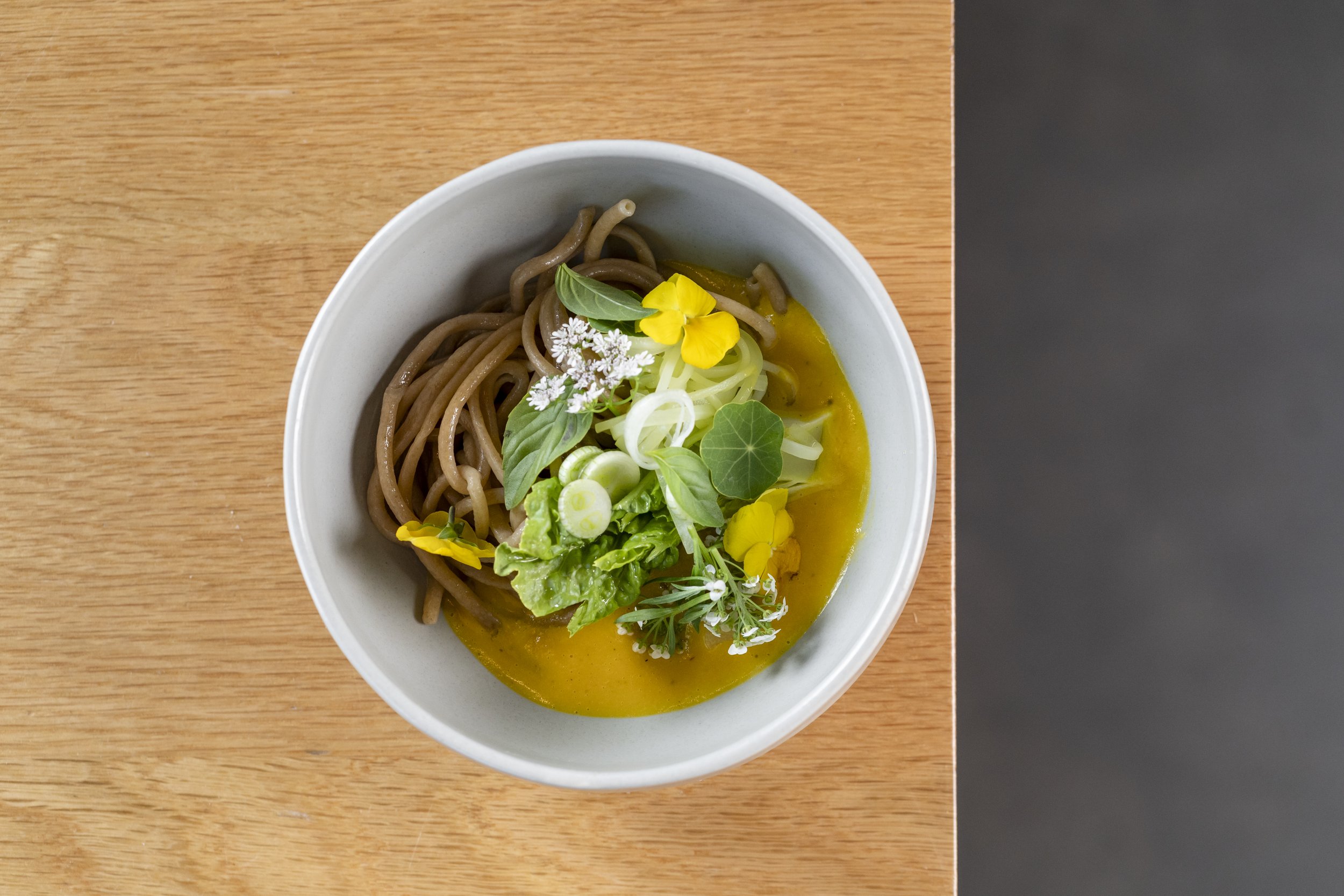 Roasted North Carolina Sweetpotato, Heirloom Grain Noodles, and Fresh Herbs