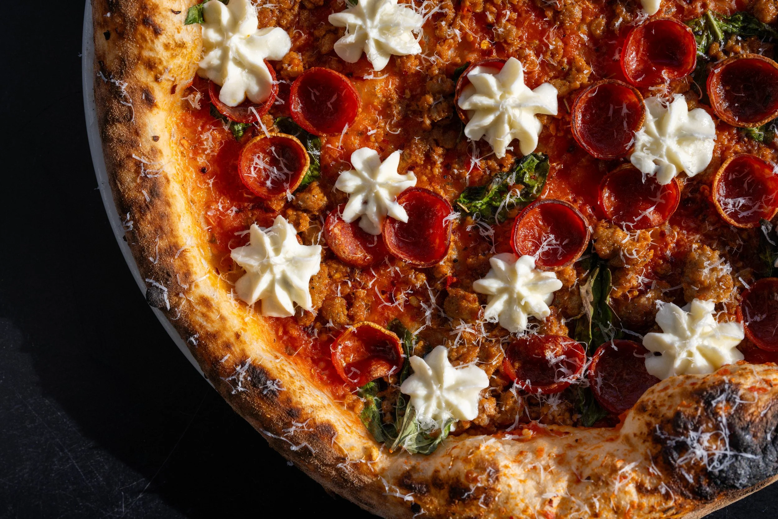 Heat a pizza oven to desired temperature. On a floured work surface, stretch 1 Pizza Dough ball to a 14-inch round. Top with 165 grams New York Sauce followed by 80 grams Fennel Pork Sausage, pepperoni, basil, garlic oil, chile flakes, and oregano. Bake until desired doneness. Remove from oven and top with 3 dollops Lemon-Garlic Ricotta and grated parmesan. Season with red chile flakes.
