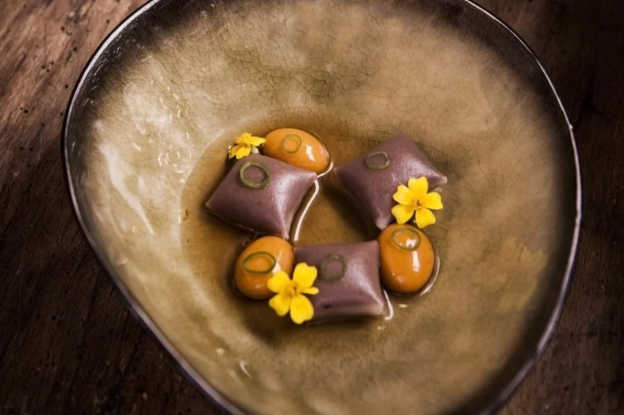 Heat combination oven to 160°C on steam. Place 3 Ravioli on a greased sheet tray. Steam 1 minute. In a serving bowl, arrange Ravioli and “Sacraments” Spheres. Top with three rings peppers. Finish with 3 marigolds. Serve with a small jug of Cabbage Broth.