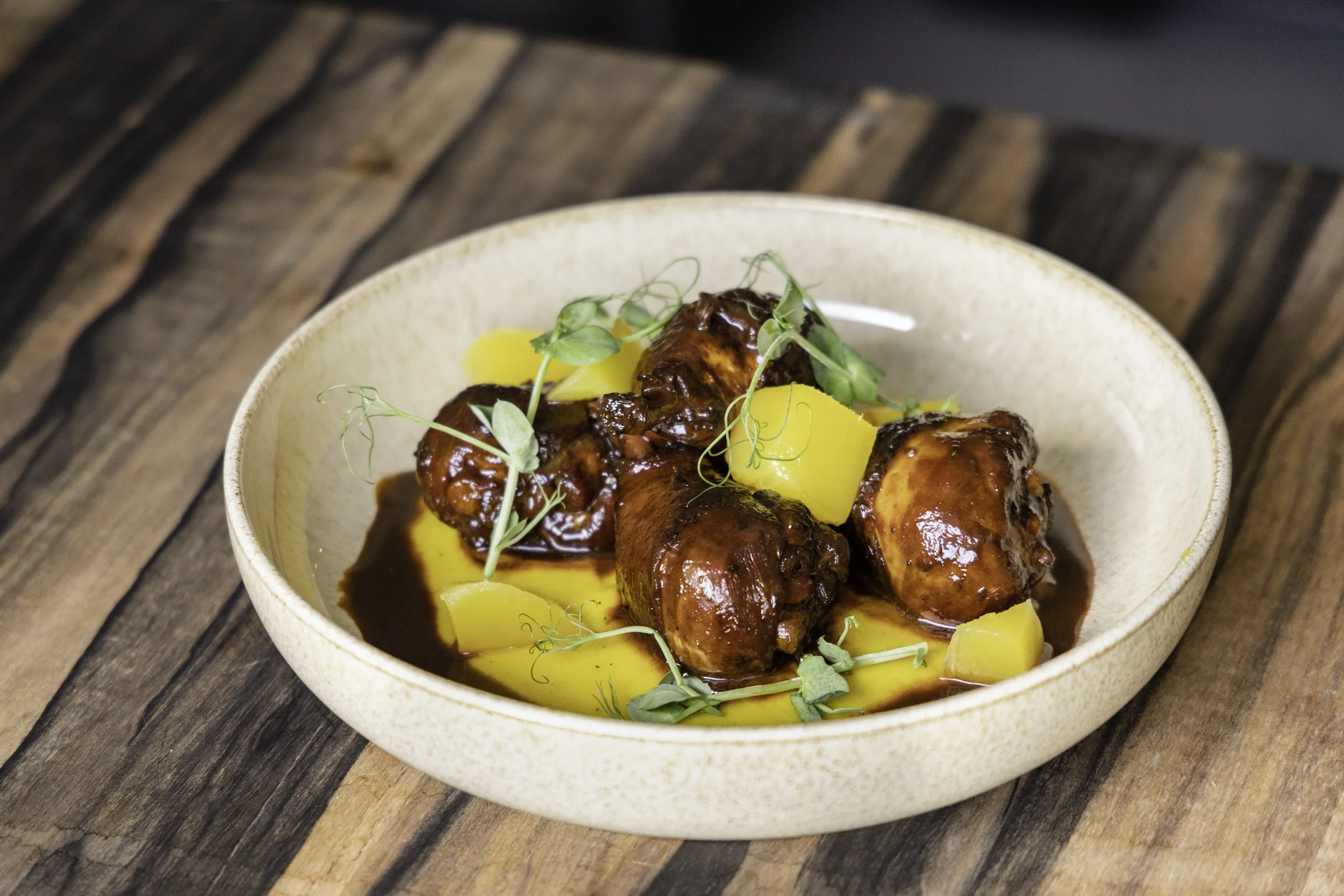Arrange 2 tablespoons Plantain Purée in a circle in the center of a serving plate. Place Trini-Braised Chicken on top of the circle. Garnish with pickled mango.