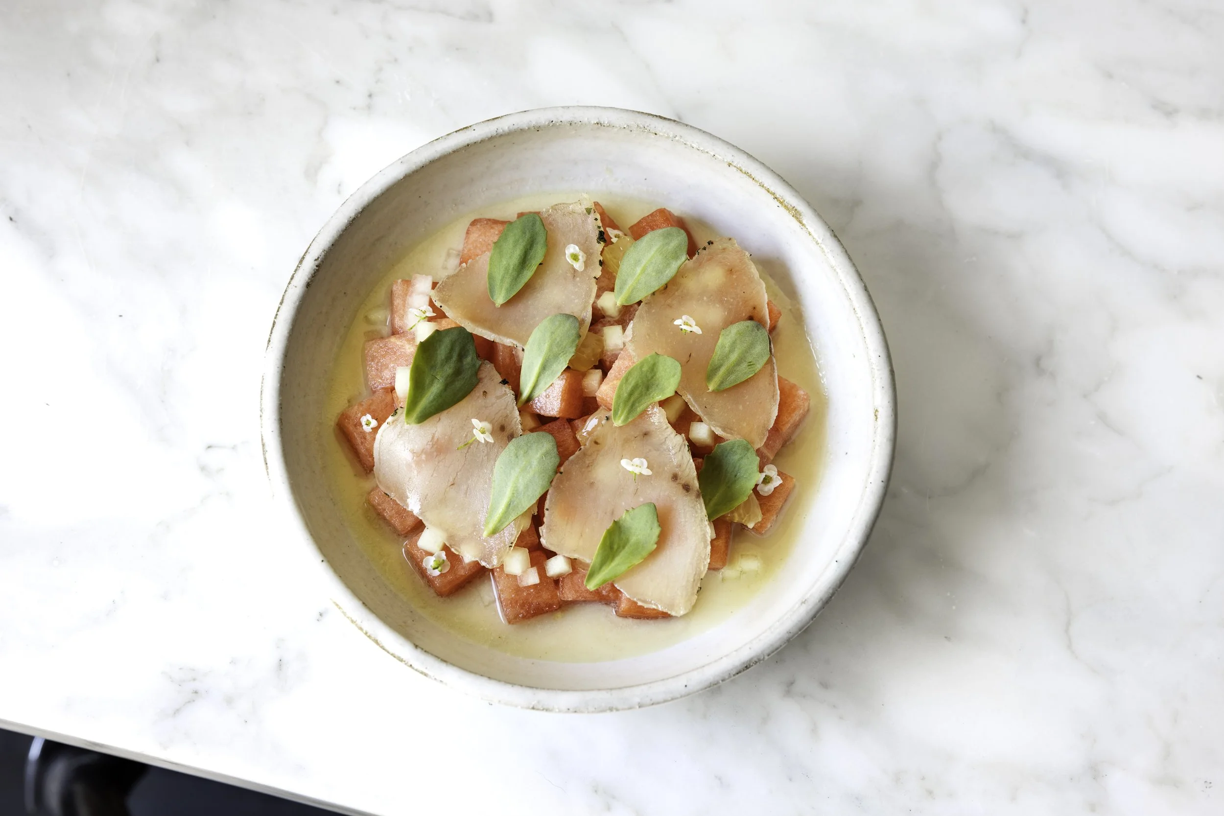Using a deli slicer, thinly slice the Pink-Peppercorn-cured Swordfish Lardo. In a bowl, mix to combine Cured Watermelon, Pickled Watermelon Rind, and Meyer lemon segments; season with sea salt. Spoon mixture into a stoneware serving bowl. Top with Corn and Buttermilk Leche de Tigre. Add Scallop Garum, followed by Meyer Lemon Oil. Dress with a bit of the pickling liquid from the Pickled Watermelon Rind. Cover with the Pink-Peppercorn-cured Swordfish Lardo slices and garnish with flowering coriander or lemon thyme.